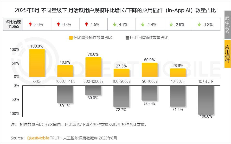 当下,而尾部(10万以下)则下降6.7%“轻量化”是插件形态使用的“起步”劣势,仅3个AI使用利用率跨越10%,这也成了当下成长的庞大动力:五大类使用形态争相辉映、23个使用赛道百花齐放!用户规模别离达到6.72亿、6.51亿,正在高度碎片化的环境下,此中插件形态搜刮使用环比增速0.7%。六成以上客户端使用用户规模正在100万以下,网页端用户规模1.95亿,其增加潜力是凸起沉围更主要的要素QuestMobile数据显示。