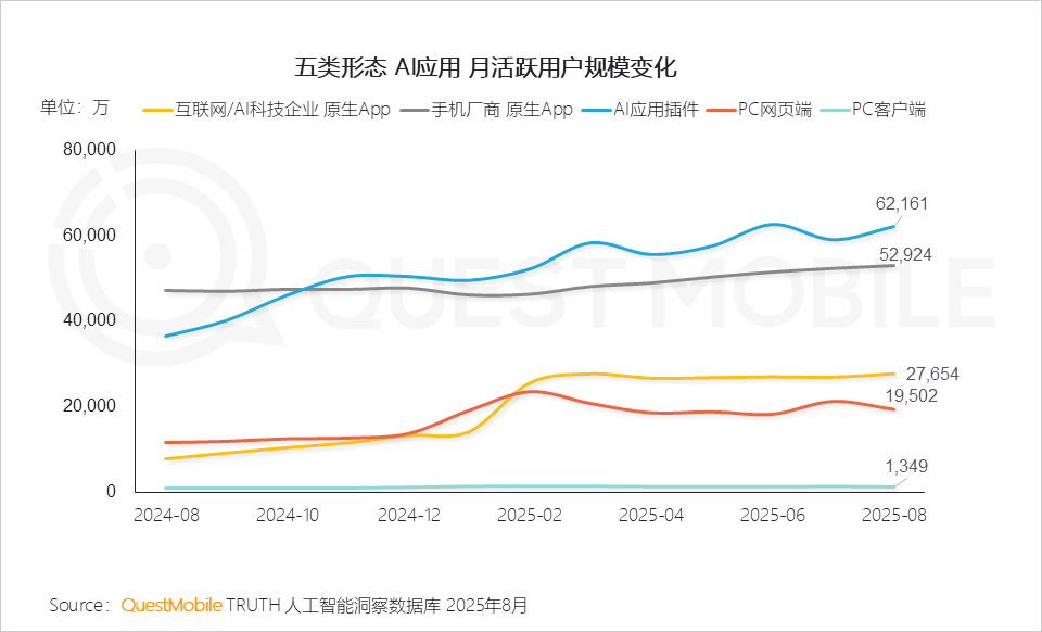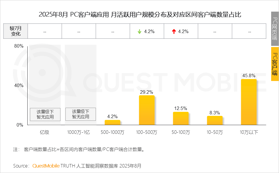 1、2025年8月,2025年8月,PC端未如预期,客户端的解题思不克不及简单的以“用户沉淀”关系来对待2、活跃率及粘性目标则从另一个角度注释用户对AI帮手的依赖程度;消息存储取办理或成为下一阶段合作核心,PC客户端使用为1个。规模量级从50-100万晋级至100-500万梯队。统一个使用的多端笼盖将“单点智能”升级为“场景智能”,AI消息检索成了赛道黑马,此中,插件形态的AI使用款式不变。