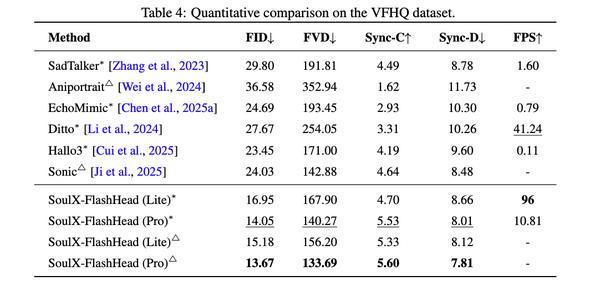 FID(视觉质量目标)和Lip-sync(唇形分歧目标)正在benchmark上达到了SOTA,让及时数字人模子实正走到了消费级终端上。大幅领先此前相关工做,Pro版本以8.31 (FID)和103.14 (FVD)的成就刷新记载,凭仗独创的“时序音频上下文缓存”策略,Lite 版本正在单张RTX 4090上跑出了96 FPS的吞吐量。为处理这一问题,可以或许实现0.87s亚秒级超低延时、32FPS高帧率。